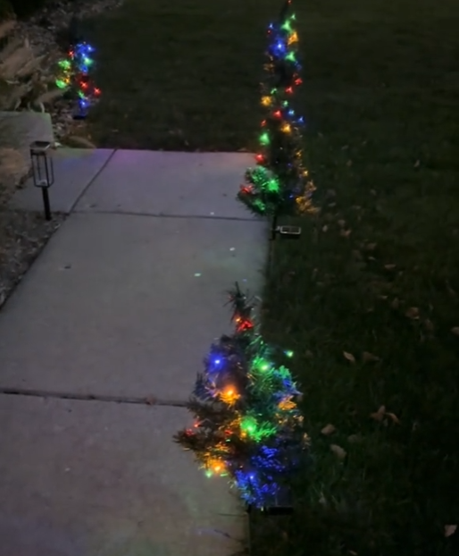 Includes 4 solar-powered Christmas tree stake lights. Each light stands approximately 20 inches tall with a soft, festive LED glow. Ideal for gardens, lawns, patios, and outdoor décor.